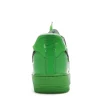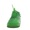 The shoes have striking green leather uppers with stitched-on metallic silver foil Swooshes on the midfoot. Along with the exposed stitching, ” AIR” embroidery at the back, repositioned tongue tags, “SHOELACES” marked laces, and a zip-tie tag, the raw construction sneaker also has repositioned tongue tags.
