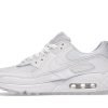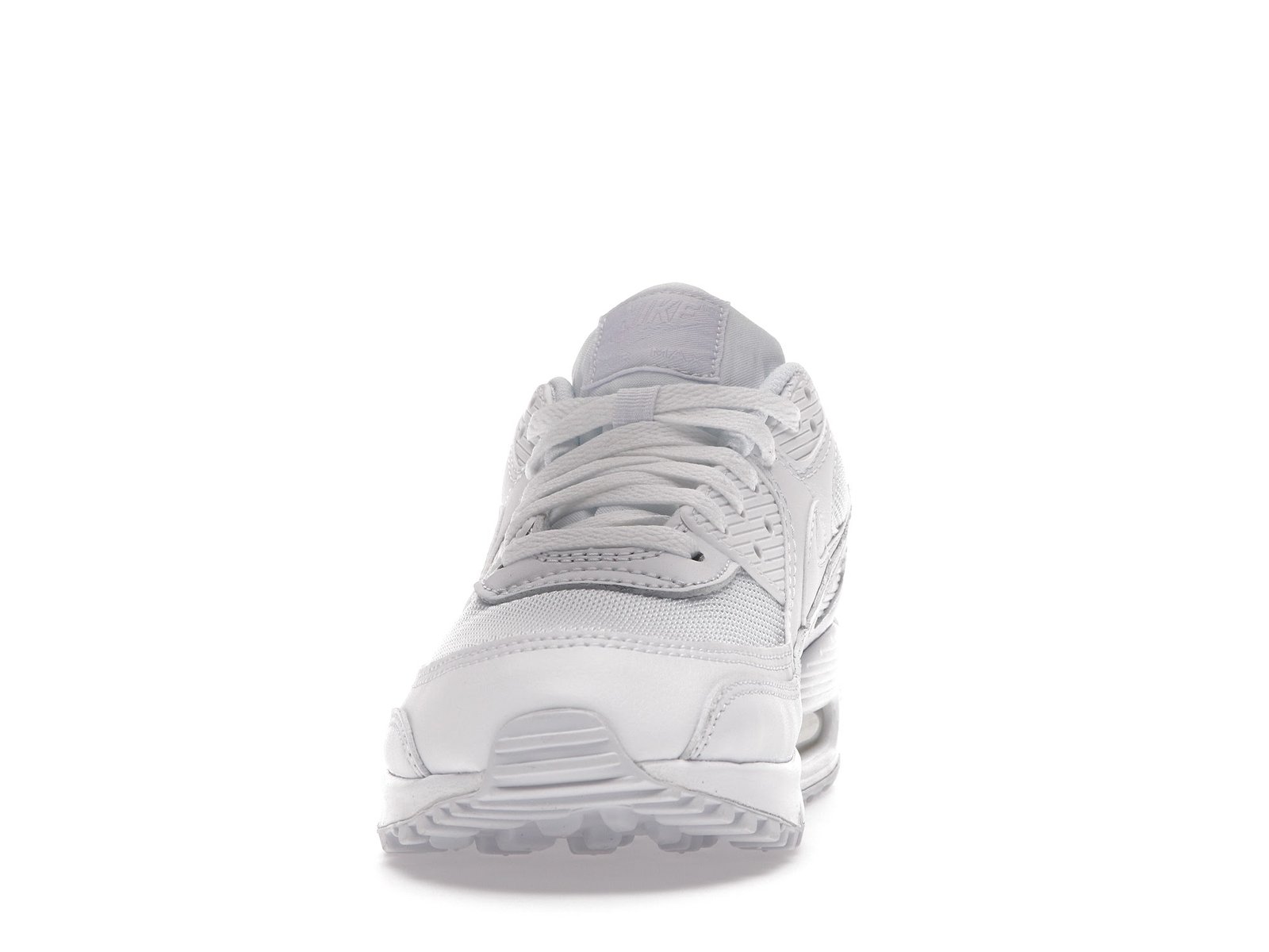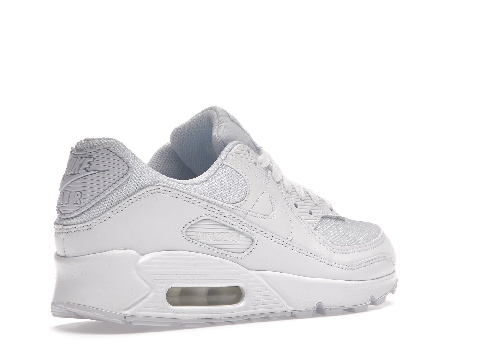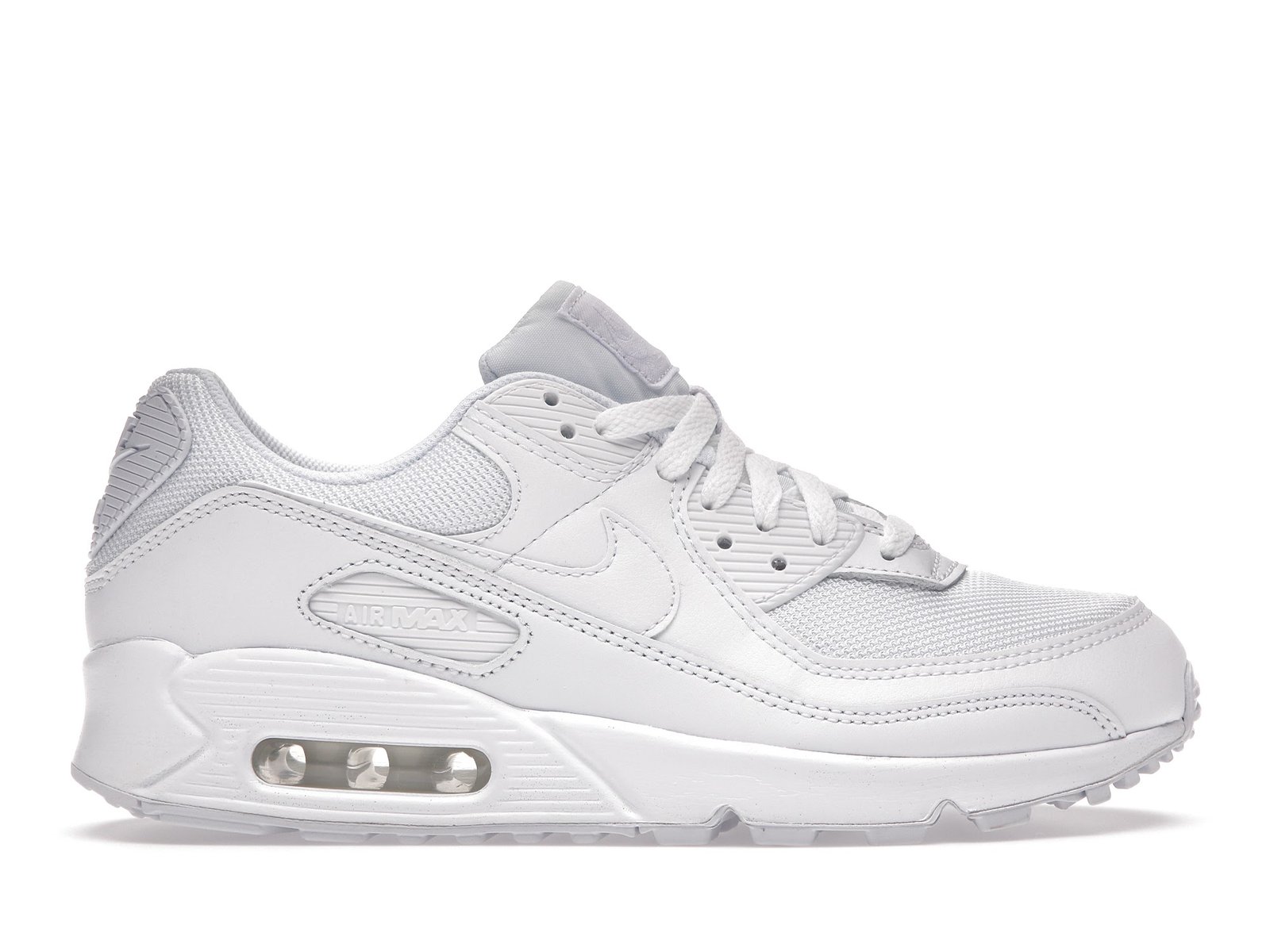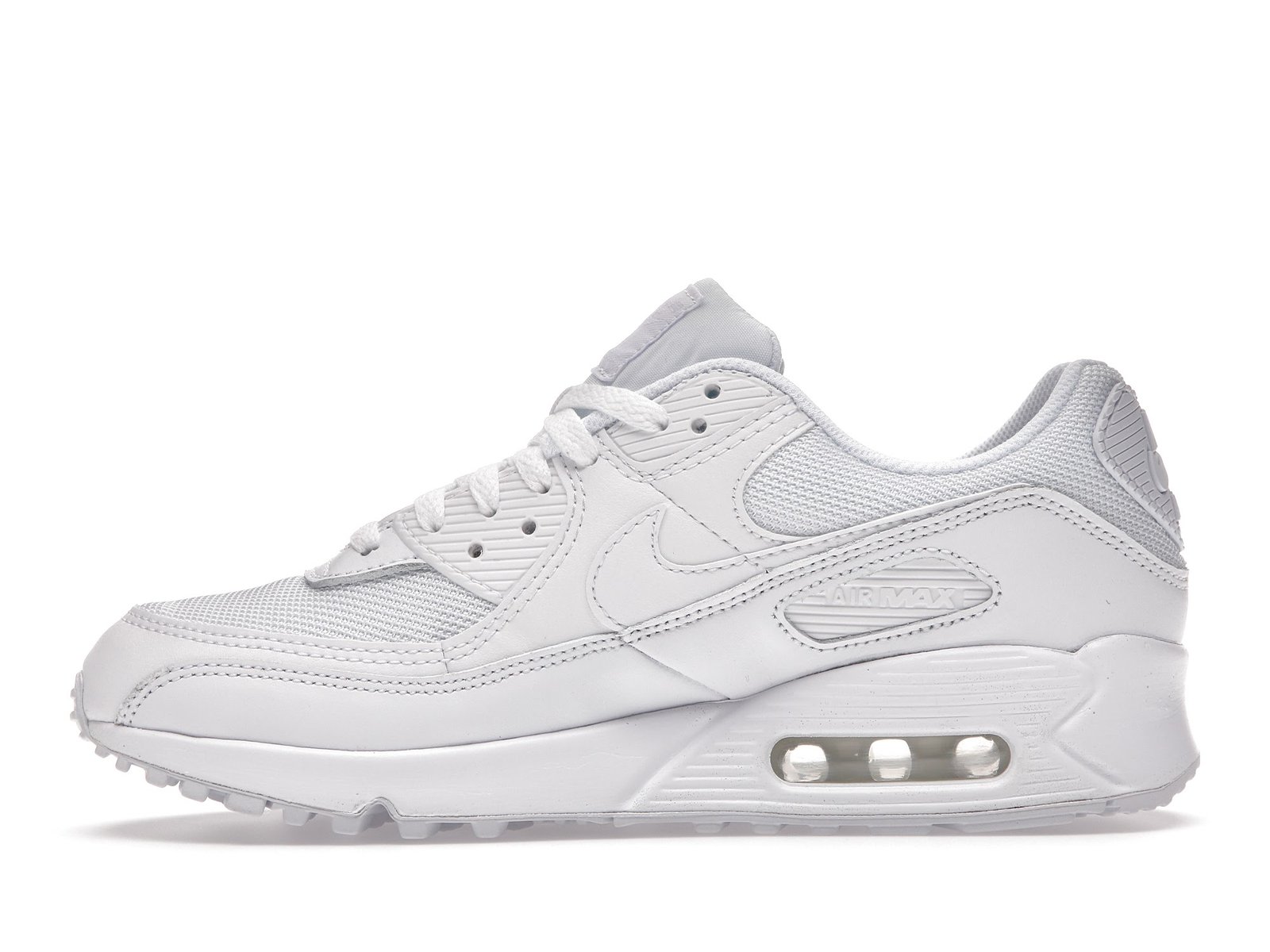 The Nike Air Max 90 triple white features a white upper with white leather , net overlays and a plain lacing section.