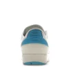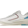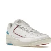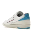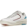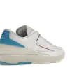 The AJ 2 Retro Low UNC To Chicago is constructed using white leather uppers, with sail colored soles and mudguard. AJ Brand used Powder Blue accents on the heel of the sneaker, while the front features the Chicago Bulls signature Gym Red on the accents on the tongue and uppers.
