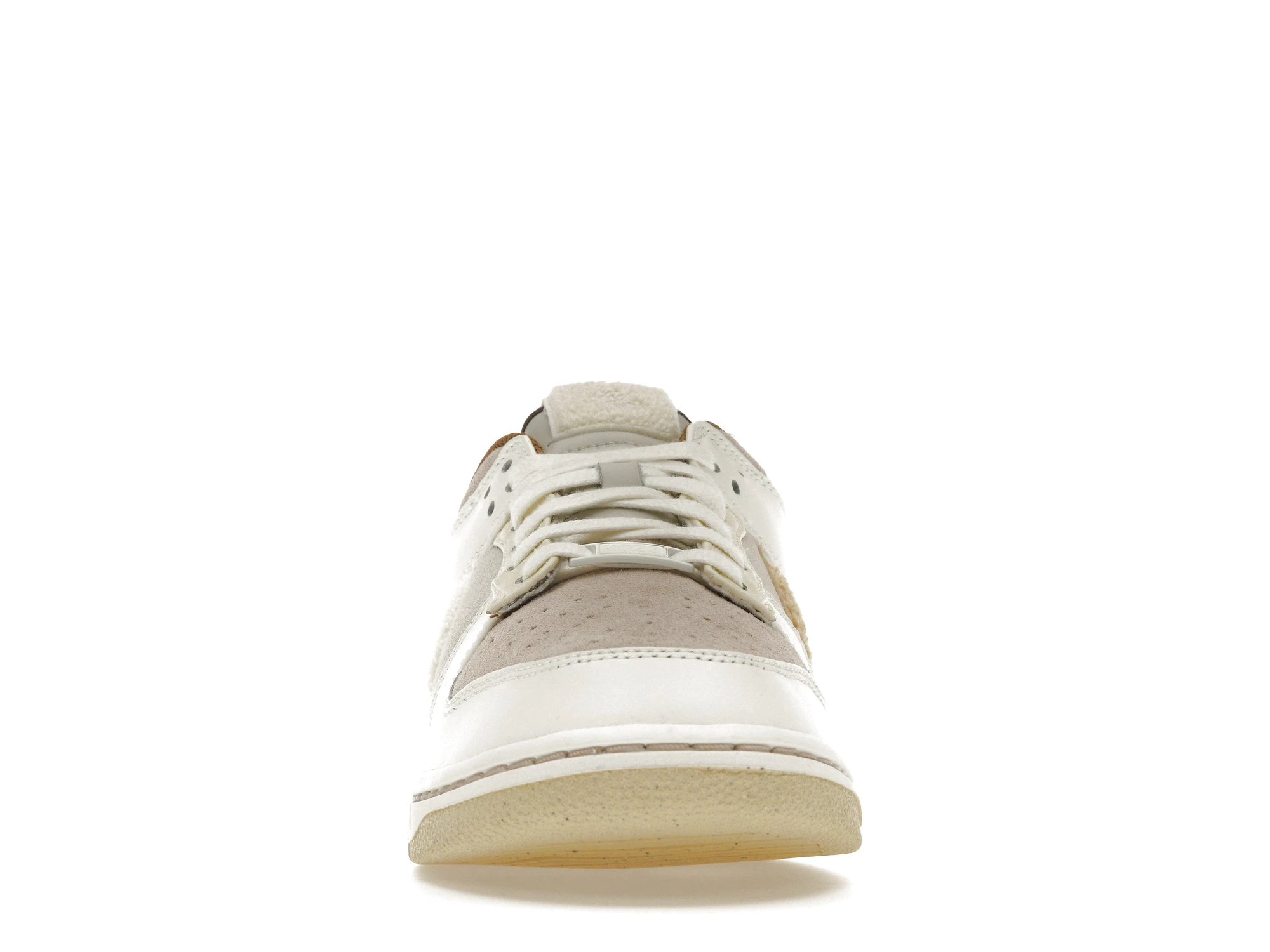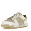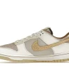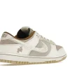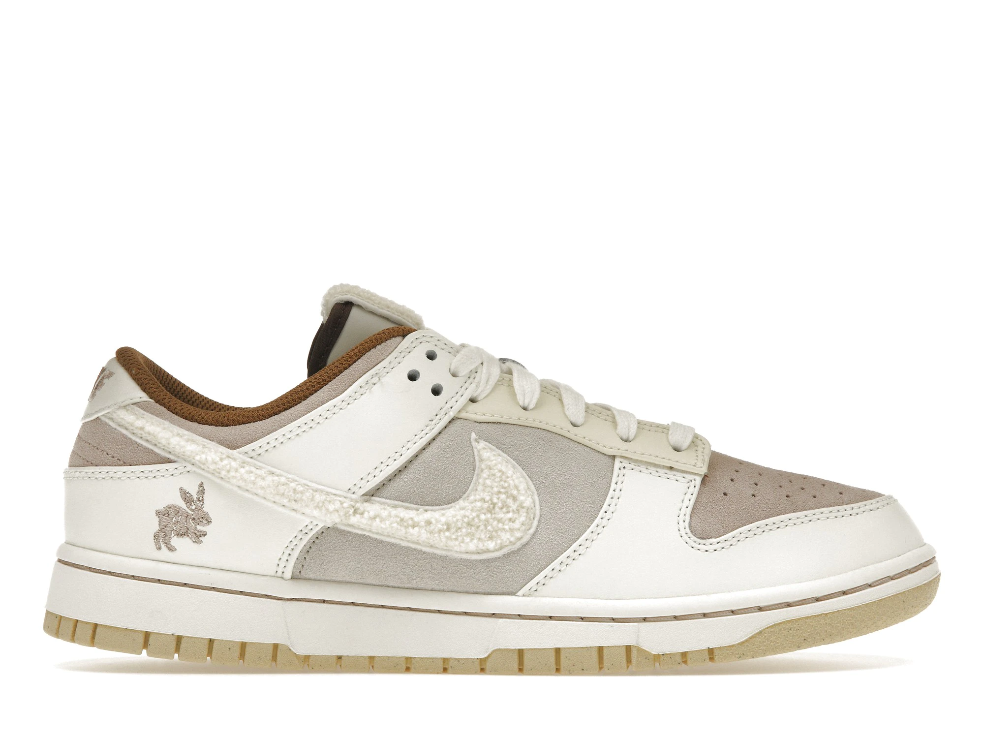 The dnk Low Retro PRM Year of the Rabbit Fossil Stone 2023 has an upper that is made of a premium suede material with Fossil Stone and Coconut Milk colors. The rabbit logo is embroidered on the heel counter and the Swoosh appears on the sides. It has a rubber sole that provides excellent traction and support.